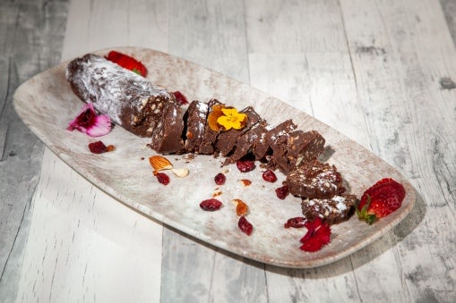 88. Once chilled, unwrap the chocolate salami log and transfer it onto a serving plate. If desired, dust the log with powdered sugar to resemble a salami.