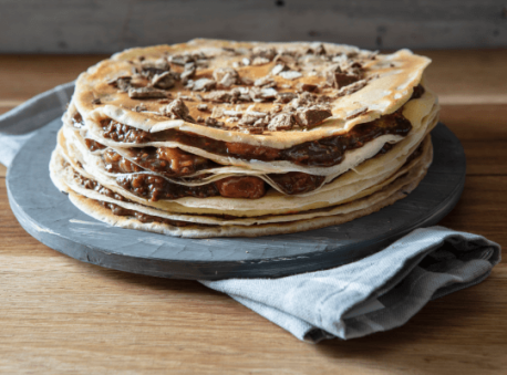17Spread 3 tablespoons of the caramelized banana KitKat on top. Place another two pancakes on top. Complete this process until all the pancakes are done.